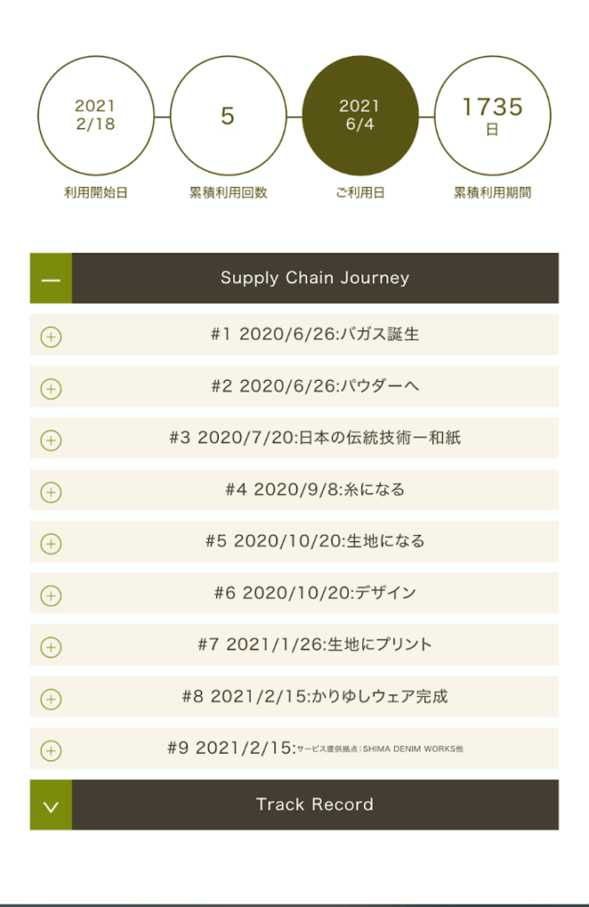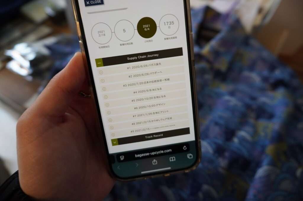 自分のスマートフォンを服にかざすだけで、画面上に「バガスの旅」が瞬時に映し出される。製糖、製紙、紡績、縫製。サトウキビが形を変えていく「14,000kmの旅路」が、各工程を通過した正確な日時の記録として可視化される。この圧倒的な透明性こそが、単なるファッションアイテムを超えた「信頼できるメディア」としての価値を、製品に付与しているのである。