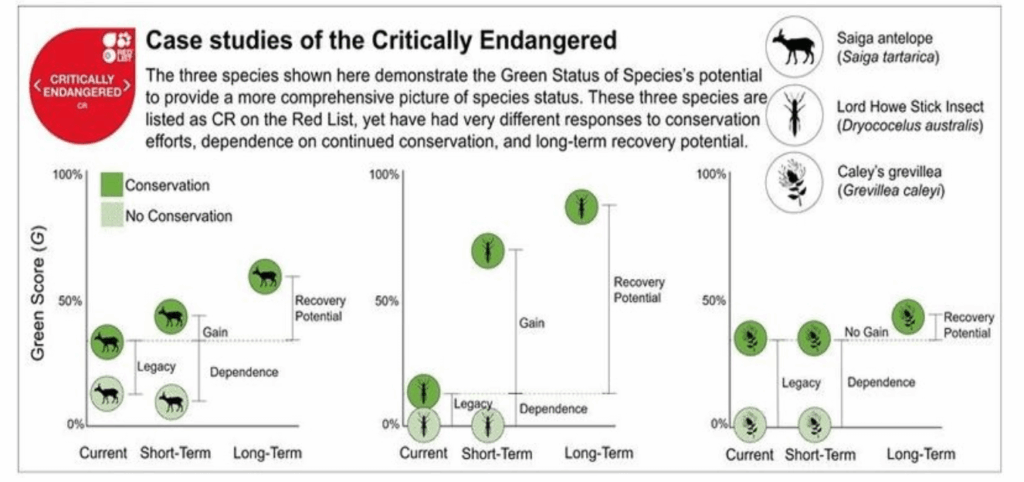 近年導入された「グリーンステータス」は、絶滅リスクの評価に加え、種の回復度や保全活動の成果を測定する指標です。[12]