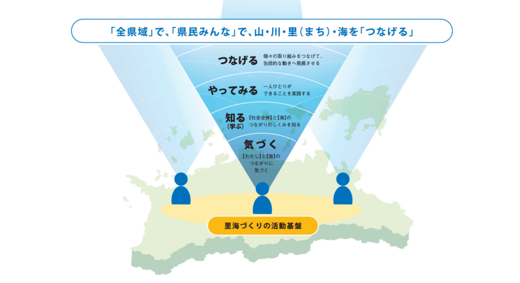 その中で、山・川・里(まち)・海を含む全県域を1つの大きなエリアと捉え、県民みんなで連携しながら「里海」づくりに取り組むという、ビジョンの基本方針が定められた。