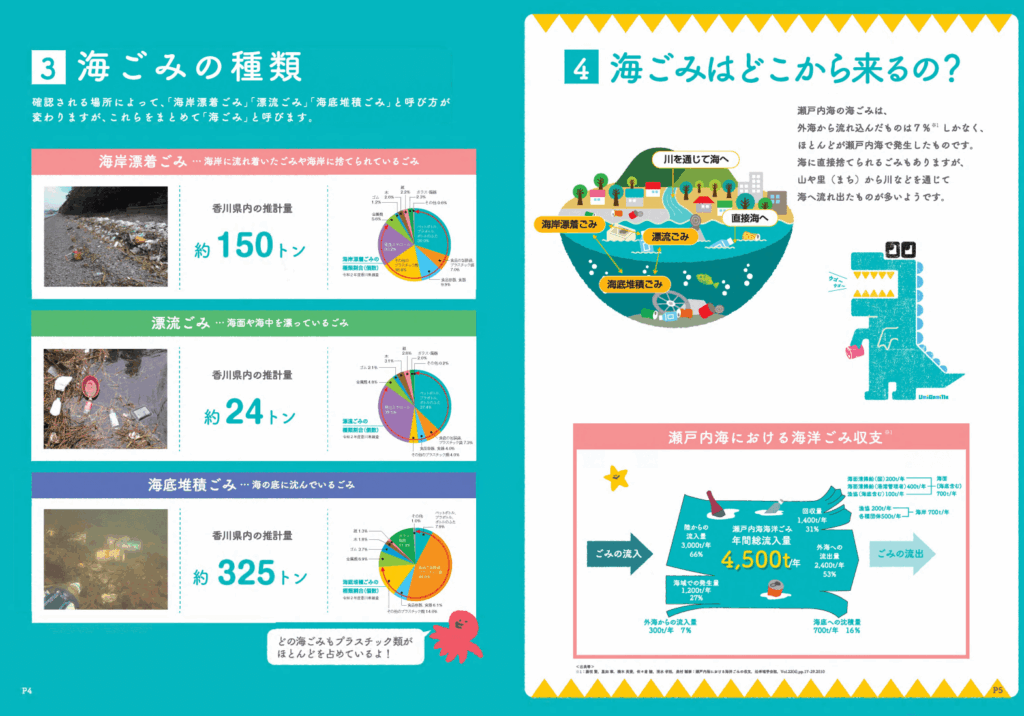 この出前講座の成功を支える強力なツールが、オリジナル教材「ウミゴミラと学ぶ 海ごみの教科書」だ。こうした分かりやすい資料を通じた啓発は、プロジェクトの初期から続く重要な取り組みでもある。