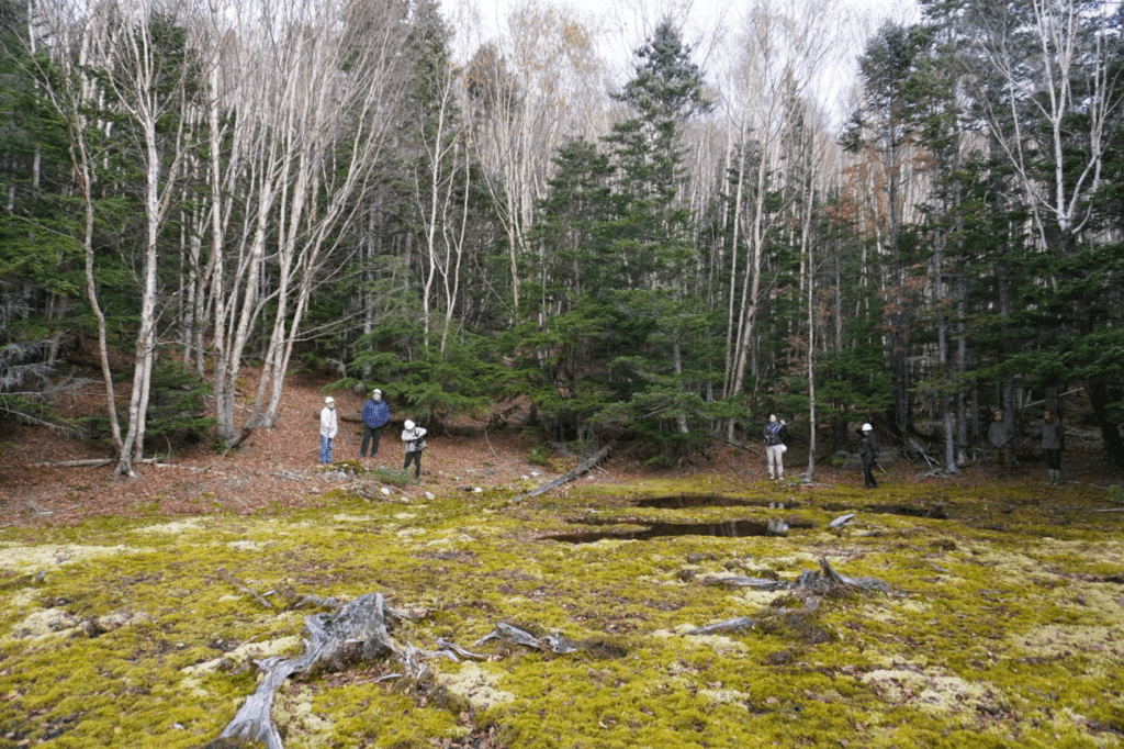 2日目は、苔の庭と見晴らし台へ向かった。ここには、標高約2,000メートルに湿地が広がっている。参加者たちは、苔むした林床が持つ保水力や、見晴らし台からの雄大な景観を通じて、理屈ではなく身体感覚として「流域の源」を感じ取っているようだった。