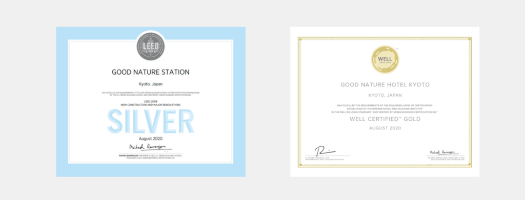 GOOD NATURE HOTEL KYOTOは、世界で初めてホテル版評価基準によるWELL認証及びLEED認証を同時に取得したホテルです。[4]
