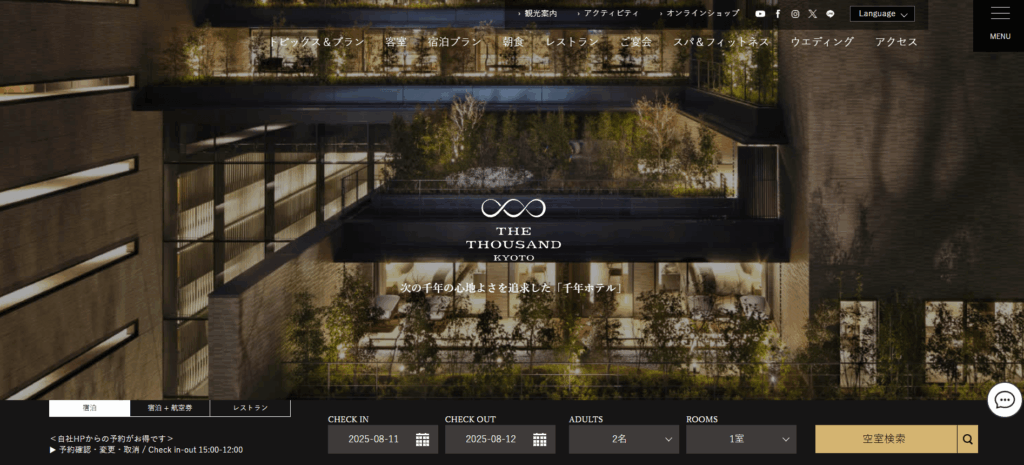 THE THOUSAND KYOTOは、千年先まで続く持続的な心地よさを追求した「千年ホテル」がコンセプトの宿泊施設です。「今だけでなく、何世代先までも心地よく過ごせる場所であり続けたい」という思いで運営されています。