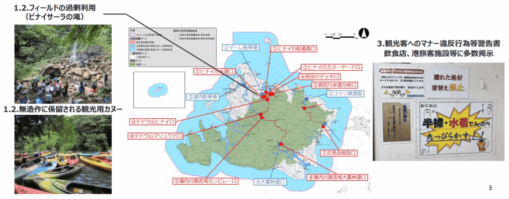 たとえば、沖縄県八重山郡竹富町では、人が足を踏み入れる機会が増えたことで岩場や木の形状が変化するなど、自然環境の悪化が確認されています。[3]