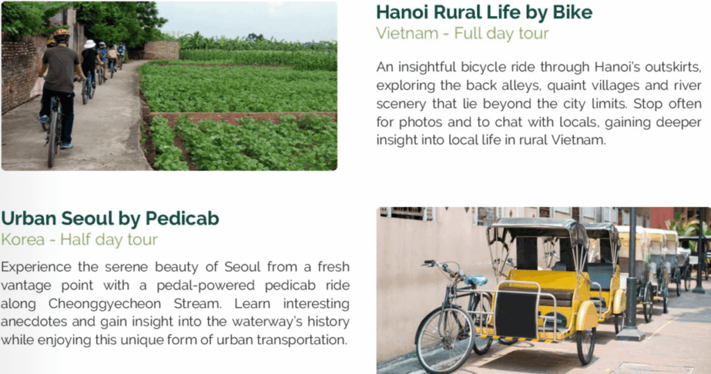 たとえば、ベトナムのハノイ郊外を巡る自転車ツアーでは、裏通りや趣ある村、川沿いの景色を探索しながら、地域の人々との会話や写真撮影を楽しむことができます。観光地では得られない田舎の生活を間近に感じられる貴重な体験です。