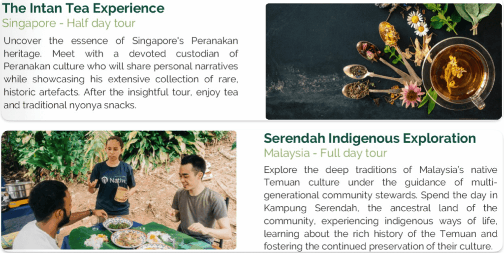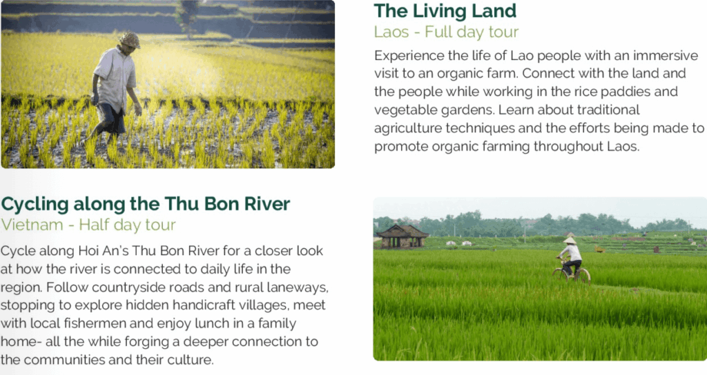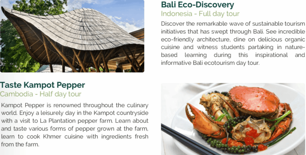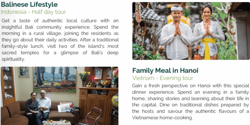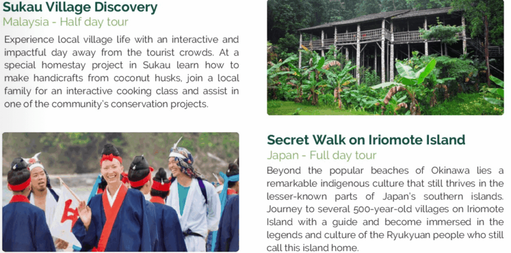 この旅は、地域の人々に利益をもたらし、旅行者が目的地とより深くつながれるように、4つのカテゴリーに分かれています。