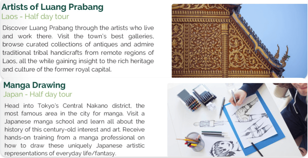 たとえば、ラオス・ルアンパバーンで芸術家たちに出会うツアーでは、ギャラリーや骨董コレクションを巡りながら、伝統工芸や街の豊かな文化遺産を知ることができます。かつて王都だった街の奥深い魅力に触れられるでしょう。