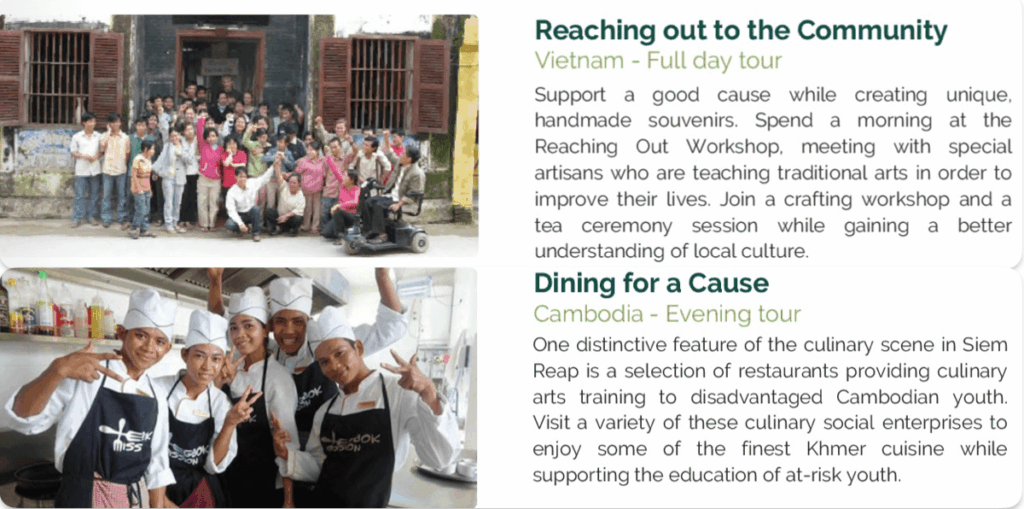 これらのプログラムでは、職業訓練レストランや伝統工芸の保存ワークショップなど、非営利団体が運営する場を訪れます。旅行者は地域文化と触れ合いながら、社会開発を後押しし、十分な機会を得られなかった人々に雇用や教育のチャンスを生み出せるのです。結果として、コミュニティの力を高め、持続可能な発展を促すことにつながります。