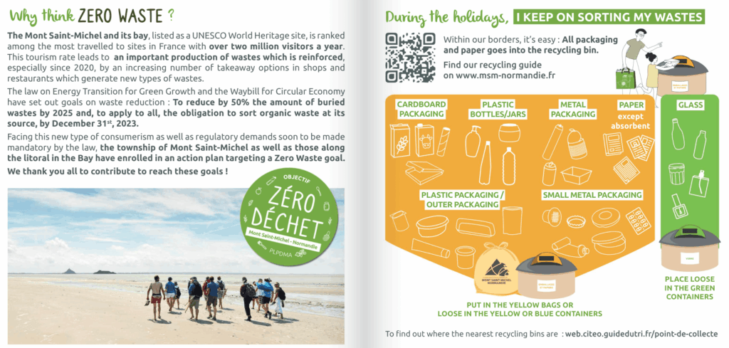 ユネスコ世界遺産モンサンミッシェルには年間約240万人が訪れ、かつては1日1トンのごみが出ていました。これを改善するため、自治体は2021年10月から観光案内所や土産店、レストランと連携し、ゼロウェイストに向けた取り組みを進めています。[18] [19]