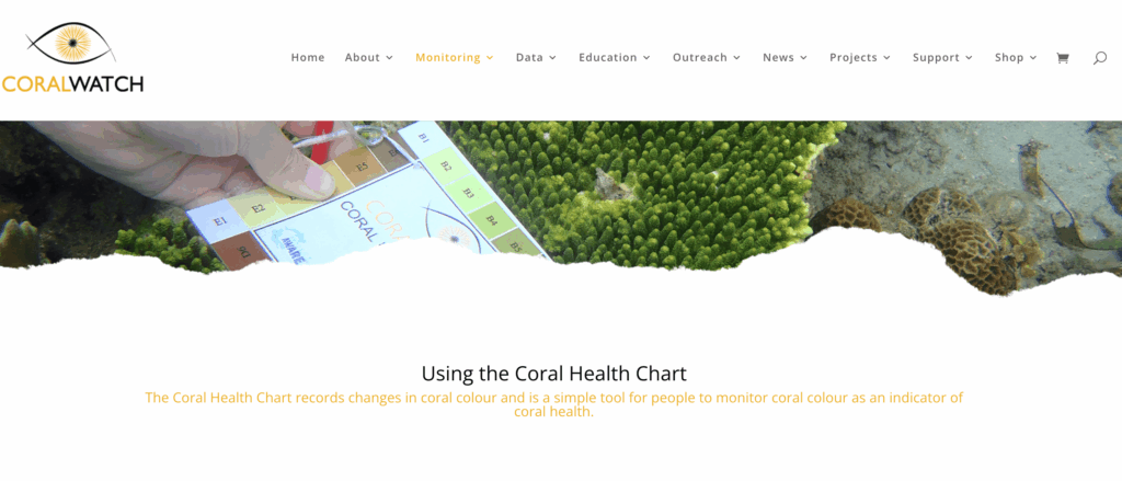 CoralWatch(コーラルウォッチ)は、2002年にオーストラリア・クイーンズランド大学が始めた市民科学プログラムです。参加者は「Coral Health Chart」と呼ばれる色見本カードでサンゴの色を6段階評価し、記録します。[5]