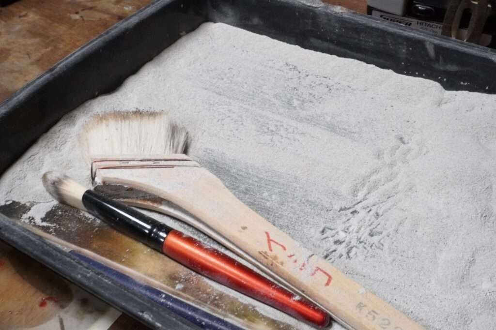 これまで産業廃棄物として、年間数十トン単位で捨てられていた庵治石の石粉。松本さんは「もったいない」という直感から、この廃材を香川県に欠けていた「地の粉」に代わる、新たな素材として再定義した。