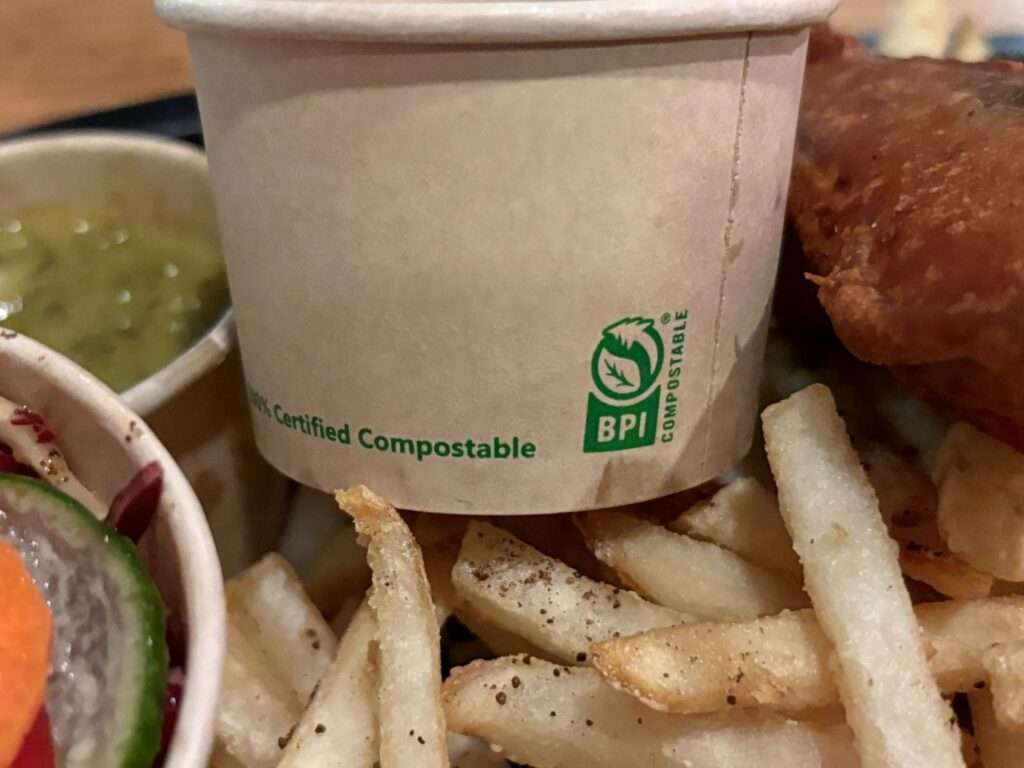 この店が掲げる「再生」の哲学は、至る所で見つけることができる。例えば、フィッシュ&チップスに添えられたソースの容器には、「100% Certified Compostable(堆肥化可能製品)」の文字とともに、北米で広く認知されている「BPI認証(Biodegradable Products Institute)」のマークが付随している。