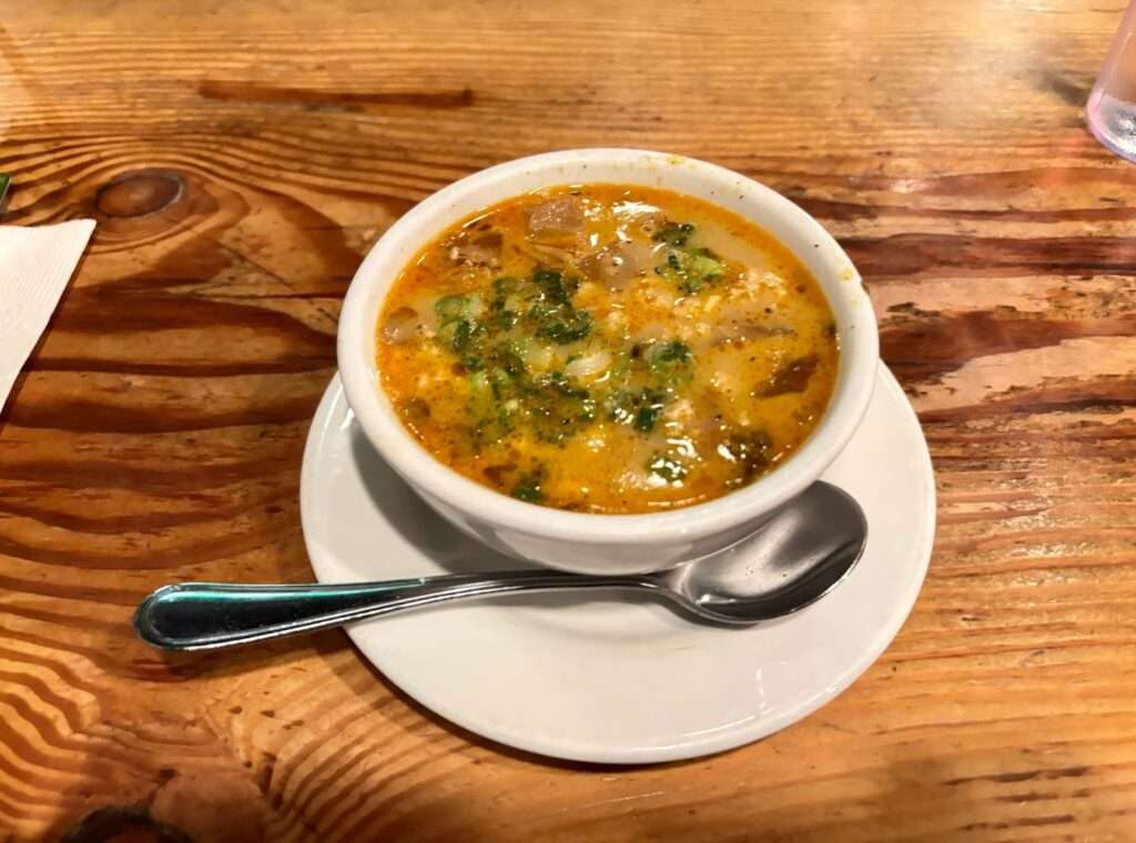 ココナッツミルクとスモークフィッシュの出汁をベースにしたチャウダー。スプーンを入れると、タイムとチリでローストされたポテトや、タラのコンフィ、そして人参、玉ねぎなどの野菜がゴロゴロと顔を出す。スパイスの香りと素材の旨みが複雑に絡み合い、冷えた身体を芯から温めてくれる。