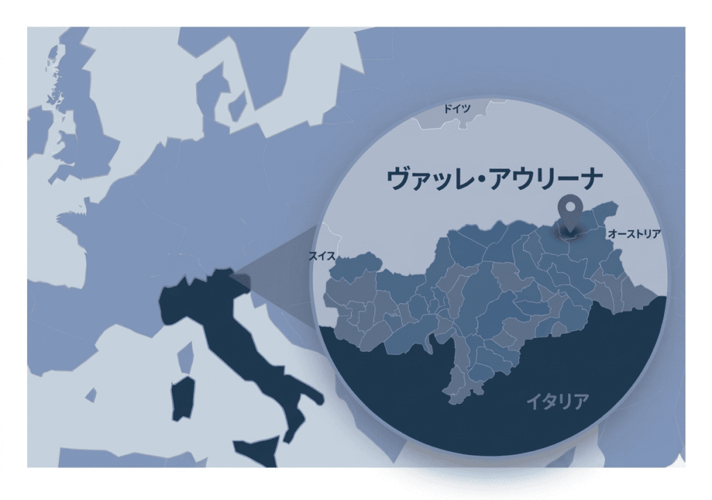 イタリア北部・南チロル州の最北エリアに位置し、オーストリア国境にも接するヴァッレ・アウリーナ(イタリア語名:Valle Aurina / ドイツ語名:Ahrntal アールンタール)は、80以上の3,000m級の山々に囲まれたアルプスの谷です。[1]