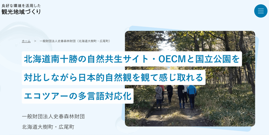北海道大樹町・広尾町北海道南十勝の自然共生サイト・OECMと国立公園を対比しながら日本的自然観を観て感じ取れるエコツアーの多言語対応化森林作業体験プログラムを多言語化・AI化し観光コンテンツへと磨き上げるとともに、地域の自然を案内できる人材を育成する。