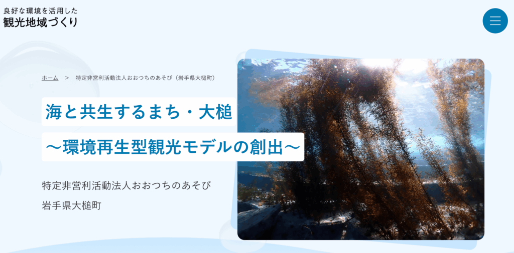 岩手県大槌町海と共生するまち・大槌~環境再生型観光モデルの創出~藻場再生を軸とした環境再生型観光プログラムの開発などを行い、地域ならではの持続可能な観光モデルを確立する。