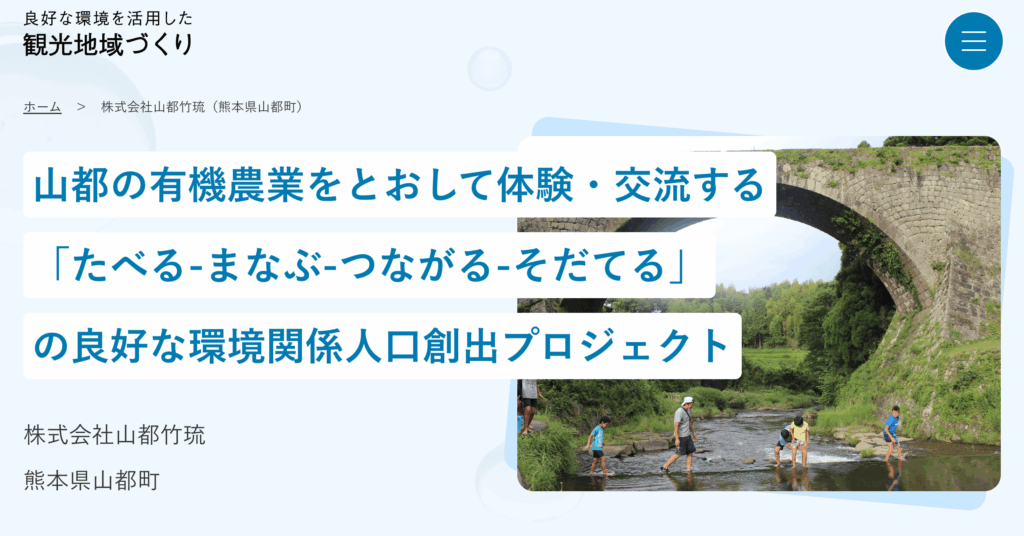 株式会社山都竹琉は、熊本県山都町で有機農業を軸としたアグロエコツーリズムの構築に取り組んでいます。アグロエコツーリズムとは、農村地域に配慮しながら訪問者がその地域の環境や文化を学び、体験する観光の形です。[5]